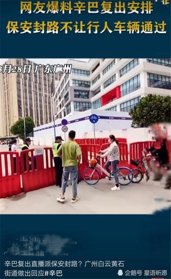 2021年3月27日,辛巴团队的复出直播派出保安“封路”。有市民要通过周边道路时,被保安人员盘问要求出示证件,影响市民出行 。