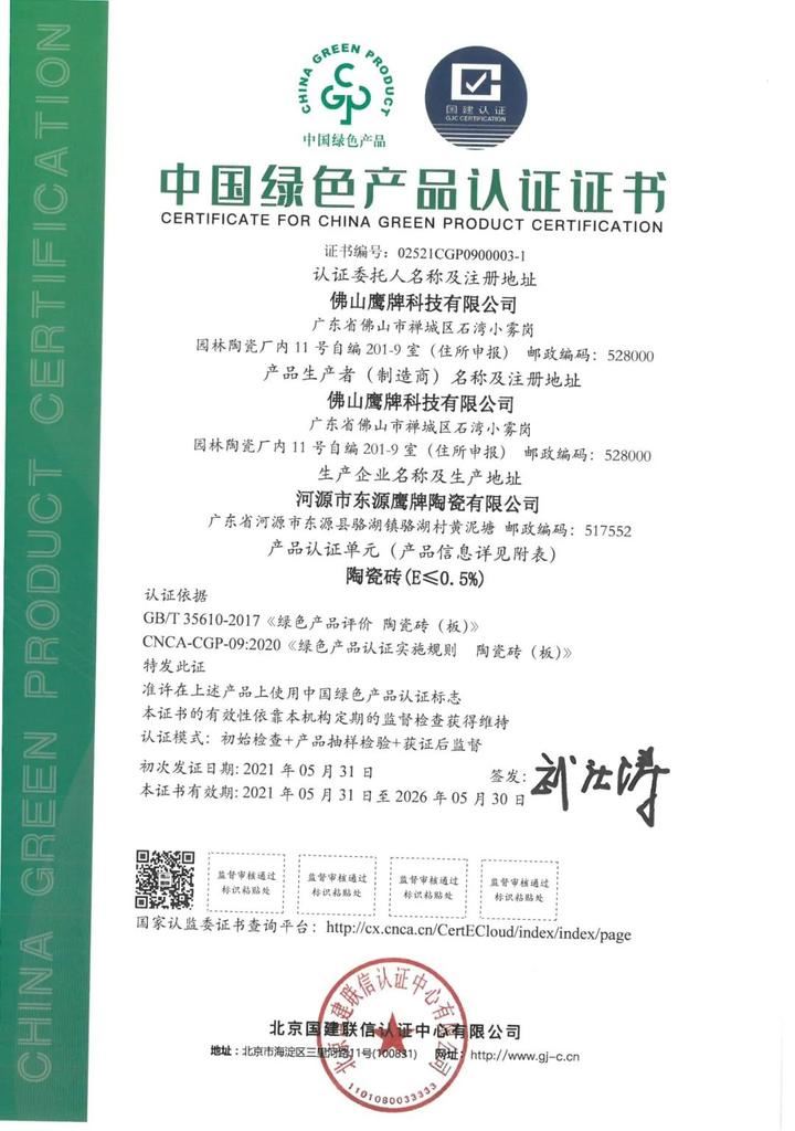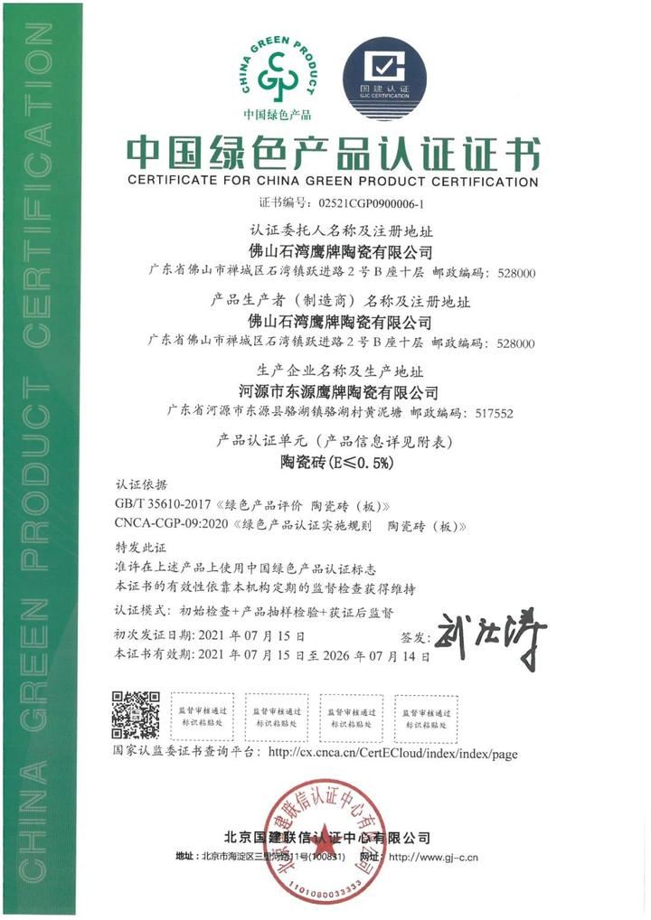 近日,鹰牌集团旗下佛山石湾鹰牌陶瓷有限公司和佛山鹰牌科技有限公司通过“中国绿色产品认证”,正式宣告鹰牌瓷砖被官方认证为绿色、健康、环保、高品质的陶瓷砖产品。