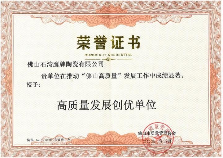 除获得《中国绿色产品认证》证书外,鹰牌还在近日举行的2021广东省陶瓷行业年会暨广东陶瓷协会第七届会员大会上获颁“《陶瓷岩板》标准参与起草单位”证书,并获得佛山市质量管理协会颁发的“高质量发展创优单位”荣誉证书。