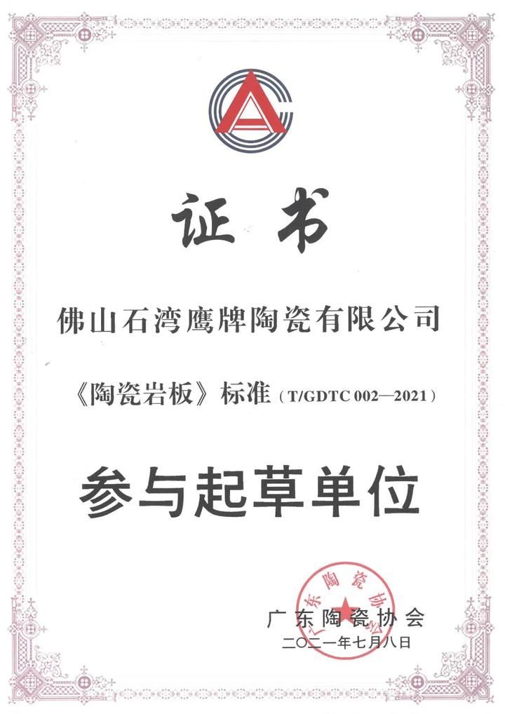 据悉,90年代以来,鹰牌集团先后参与了22项国家和行业标准的制定,推动了陶瓷产业的标准化规范化管理。2017年,鹰牌集团参编“防滑陶瓷砖的国家标准”;2019年,参编“陶瓷砖防滑性等级评价的国家标准”及“烧结透水砖团体标准”;2019年6月,作为主编单位编写“陶瓷大板施工技术规程”。2018年9月,鹰牌更前往意大利参与了“防滑陶瓷砖国际标准”的制定。