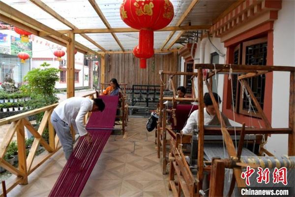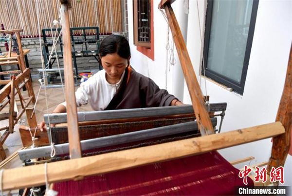 中新网汶川7月1日电(伍排勇)“这是我们利用藏族传统手工艺生产的围脖,现在生产订单已经排满,正在加快生产。”最近,在四川汶川县映秀镇渔子溪村渔家大院内,来自阿坝县麦尔玛镇兰措马村的“80后”藏族青年山鹰正和村民们忙着赶制围脖订单,几台罕见的老式织布机通过村民灵巧的双手将一条条精美绒线编制成围脖、披肩等装饰品。