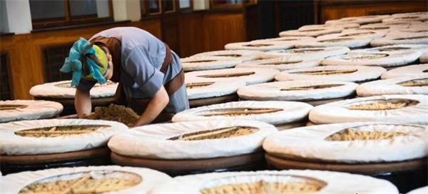 ---酵,蒸料后摊平冷却,加入传统大曲,大缸酒精发酵,历时21600分钟,酵后辅以麸皮、谷糠、稻壳,每日手工翻醅,发酵12960分钟。