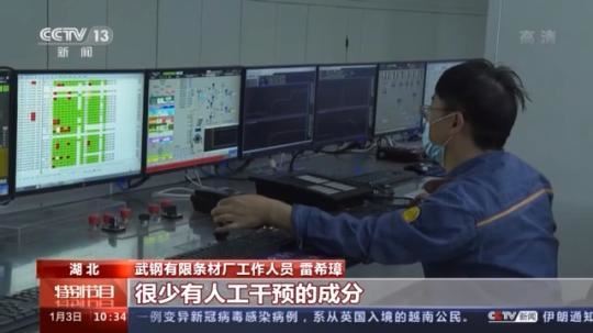 武钢有限条材厂工作人员 雷希璋:这是我们的操控中心,就是从炼钢到轧钢,我们的智慧制造推进的情况,目前这个都是全自动控制的,很少有人工干预的成分。