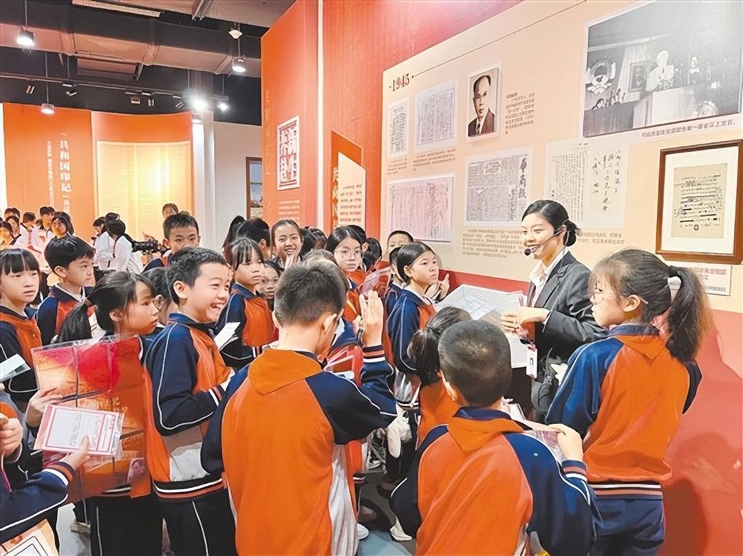 开幕当天,“共和国印记主题研学”同步进行,来自江门市美景小学、范罗冈小学以及江门技师学院的师生作为首批研学团成员,深入展厅开启红色文化浸润之旅。同学们手持定制九宫格知识卡片,在讲解员带领下穿梭于展厅的各个部分,重温中华人民共和国的成立、改革开放等历史场景。