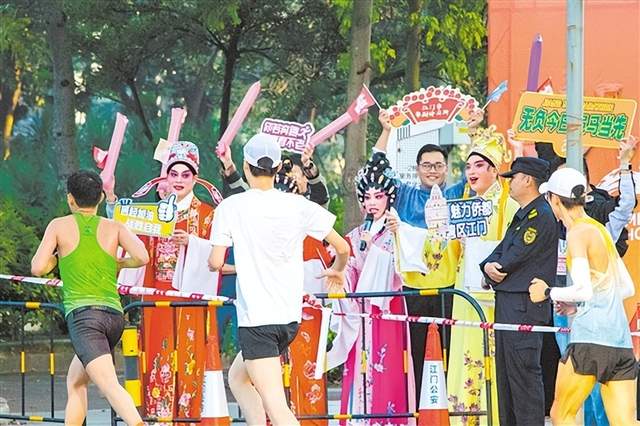 ​​​​​​​       今年江马的跑道,被跑者们誉为一条“会唱歌、有故事”的风景线。组委会精心打造的“音乐赛道”,将27个氛围点化作27个流动的舞台。在体育路保利公寓转华盛路氛围点,江门市粤剧传习所的演员们一曲曲经典粤曲,婉转唱腔吸引不少选手放慢脚步拍照记录,吸引观众驻足聆听、沉醉其中。