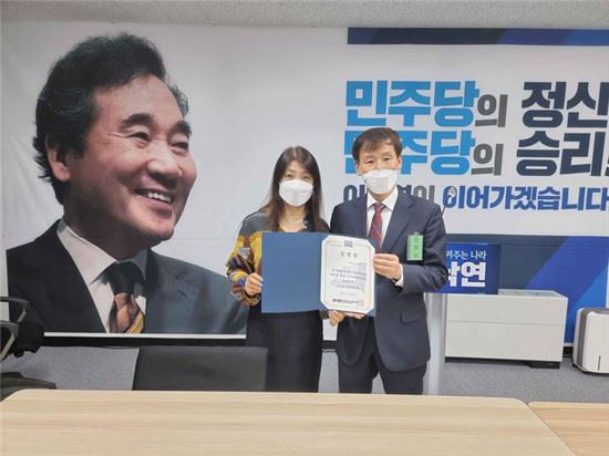 韩执政党共同民主党总统候选人李洛渊竞选对策委员会组织室长朴倧白박종백(右)代表李洛渊向赵艳霞(左)颁发任命状后共同合影留念。