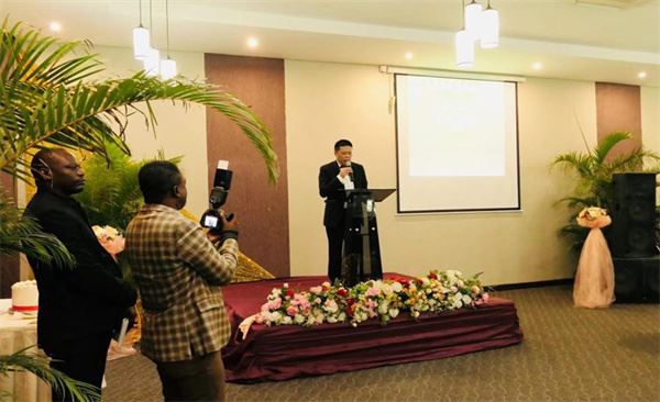 仪式上,赞比亚华侨华人总会副会长、銅带省分会会长王新首先代表赞比亚华侨华人总会对与会来宾表示感谢,对吴秀金担任赞比亚联络处处长表示祝贺。