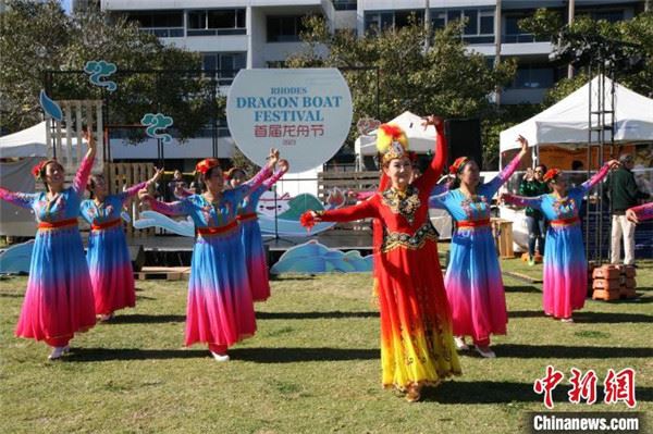 2023年7月8日,澳大利亚首届旱地端午龙舟节在悉尼罗兹区海滨公园开幕。图为开幕式现场进行的歌舞助兴表演。 中新社记者 顾时宏 摄