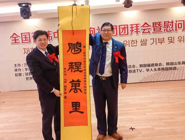活动现场上,为了答谢驻韩中国大使馆对在韩中国同胞们的关心和厚爱,全国在韩中国同胞联合会顾问白云慎(右)还自发的为公参兼总领事钟洪糯(左)赠送了书法作品后合影留念