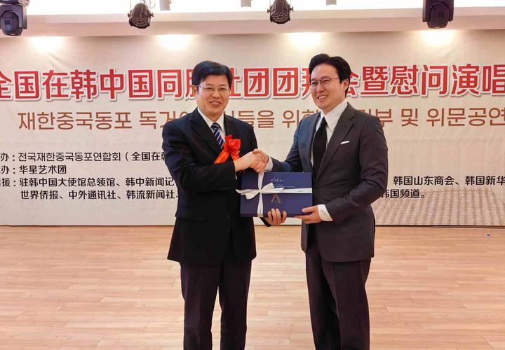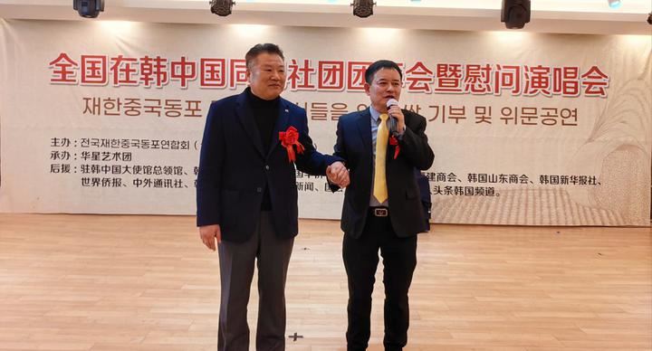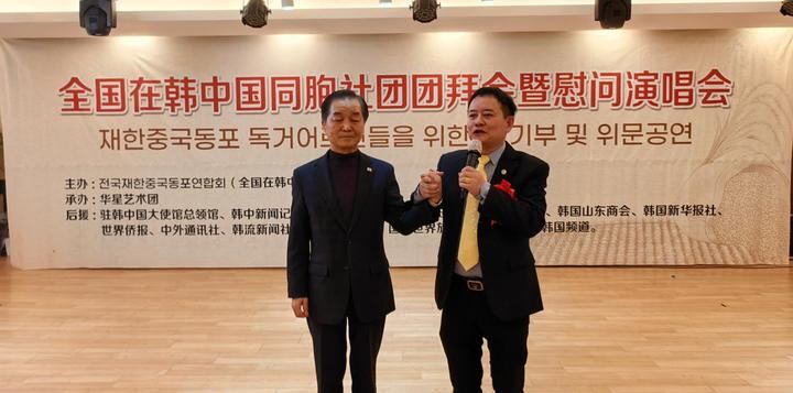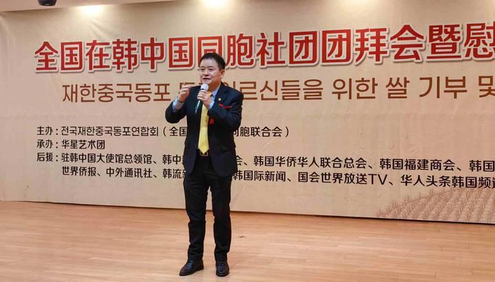 1月20日,由全国在韩中国同胞联合会主办,韩中新闻记者协会协办,华星艺术团和阳光艺术团等承办,驻韩中国大使馆等后援赞助的大型慰问演唱会,在首尔大林洞中华大酒店隆重举行。当日16时整,大型旅韩同胞侨团团侨社团拜会暨资助独孤老人慈善捐赠大米及慰问演唱会正式拉开帷幕,旅韩侨团侨社代表及独孤老人代表三百余人应邀出席晚宴招待会。