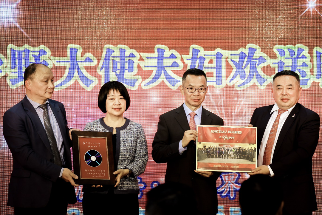 侨界代表向卢沙野大使及夫人赠送纪念品