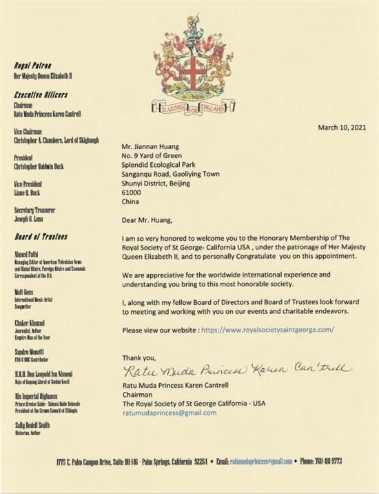 近日,凯伦·坎特雷尔专门给黄建南写了一封贺信。她在信中说,非常荣幸地欢迎您在伊丽莎白二世女王陛下的支持下成为美国圣乔治加利福尼亚皇家学会的荣誉会员,并亲自祝贺您的任命。“这是英国皇家学会五名董事投票表决通过的。我们感谢您为这个最光荣的社会带来的全球国际经验和理解。我以及我的董事会成员都期待与您相会。也邀请您参与我们的活动和慈善事业中。”凯伦·坎特雷尔表示。