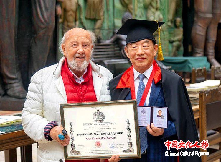 中国文化人物(记者 苏晴)8月28日,俄罗斯艺术科学院举行隆重仪式,授予中国艺术研究院特聘研究员、俄罗斯列宾美院荣誉教授韩玉臣荣誉院士,以表彰他为推动中国艺术发展和中俄文化艺术交流所作出的突出贡献。俄罗斯艺术科学院院长祖拉布·采利捷里向韩玉臣颁授荣誉院士证书,俄罗斯艺术科学院第一副院长维克多·卡列宁、副院长安德烈·佐罗多夫、俄罗斯列宾美院院长西蒙·米哈伊洛夫斯基等艺术界知名人士,共同见证了这一庄严时刻。