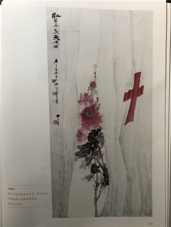 图为王菊芳的作品《红花今为天使开》,创作的初衷是病房的一角牡丹盛开,似乎在向抗疫的白衣天使微笑,入展浙江省美术馆展出并收藏入册。