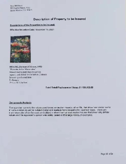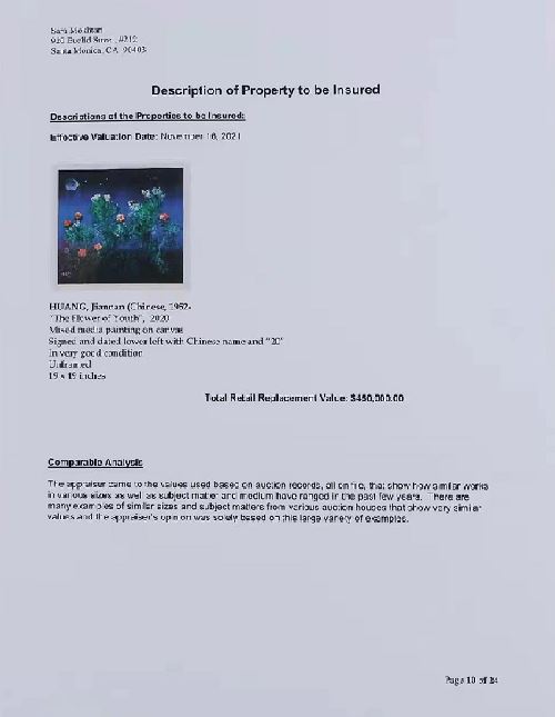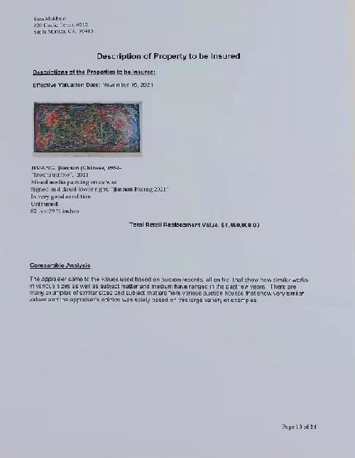 本次为黄建南评估三幅油画的鉴定机构是长期从事高端艺术品鉴定机构,鉴定专家萨拉·莫赫塔里(Sara Mokhtari)是一位具有35年艺术品评估资格的鉴定师。她具有全美鉴定估价执照(Associate with the Appraisal’s Association of America),她对伦勃朗、丢勒等古典大师的版画、素描,18、19世纪法国版画和绘画,以及美好年代画派、印象派,对毕加索、夏加尔、达利、米罗、马蒂斯等现代大师都有丰富的鉴定估价经验。