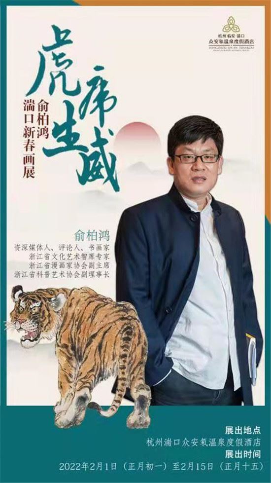 浙江文化交流讯(浙江日报高级记者 章建民)又是旧历新年临近,浙江媒体人、著名生肖画家俞柏鸿又忙开了,他告诉我们,农历2022年是虎年,虎年画虎,虎虎生威,通过一年时间准备, “虎虎生威·俞柏鸿湍口新春画展”将于2月1日(正月初一)至2月15日(正月十五)在浙江省杭州市临安区著名的湍口温泉举办。