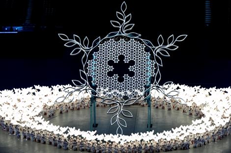 千万雪花,竞相开放。万千你我,汇聚成一个家……随着清澈的童声的响起,《雪花》篇章拉开帷幕,灯光下,孩子们手持发光的“小鸽子”,脚踩着“小雪花”,从四面八方奔跑着、跳跃着,汇聚到场中央组成一颗心,660个孩子在鸟巢中无拘无束地起舞、游戏,歌声悠扬清澈,舞姿天真动人。而“一鸽也不能少”的设计犹如点睛之笔,让整段表演更加温情而浪漫,令人印象深刻。这首主题歌的表演段落,是由北京爱乐合唱团和11个不同小学金帆舞蹈团的学生共同演绎。实时动捕技术营造出每一只“小鸽子”脚下的点点星光,而一反以往的自然表演更加体现了我们的文化自信。