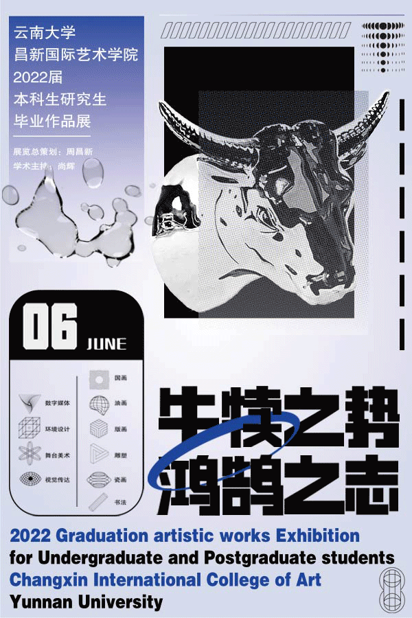 云南大学昌新国际艺术学院成功举办2022届本科生、硕士生“牛犊之势·鸿鹄之志”毕业作品展,展览共分数字媒体、环境设计、舞台美术、视觉传达、国画、油画、版画、雕塑、瓷画、书法、作曲、音乐表演等十二个专业方向。