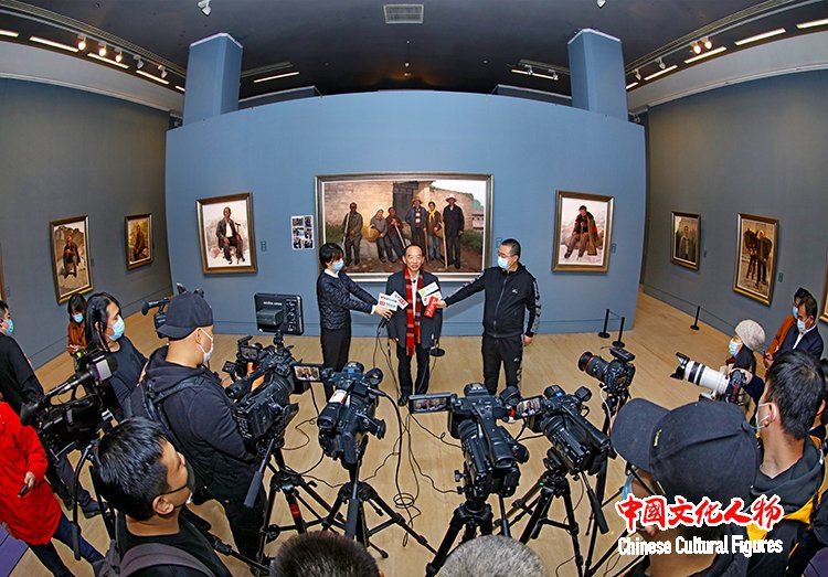韩玉臣在“璞心逐梦——韩玉臣油画写生作品展”开幕式上接受海内外主流媒体的采访