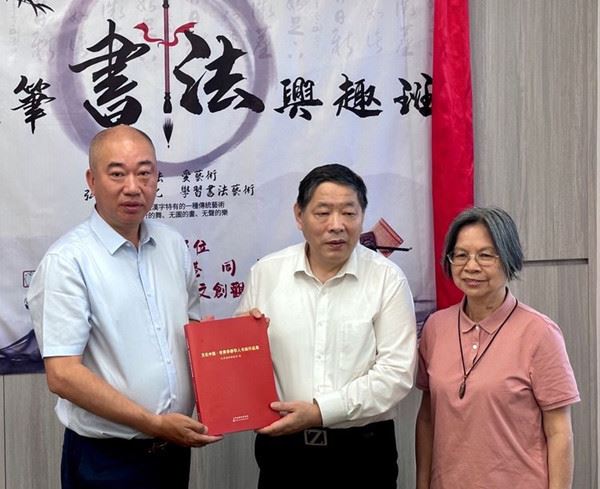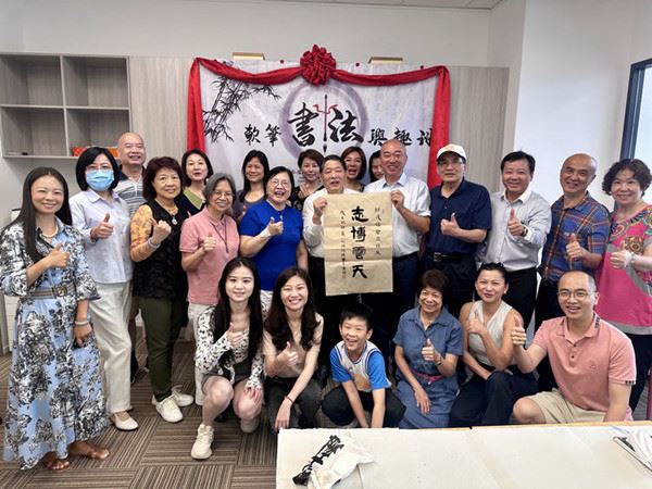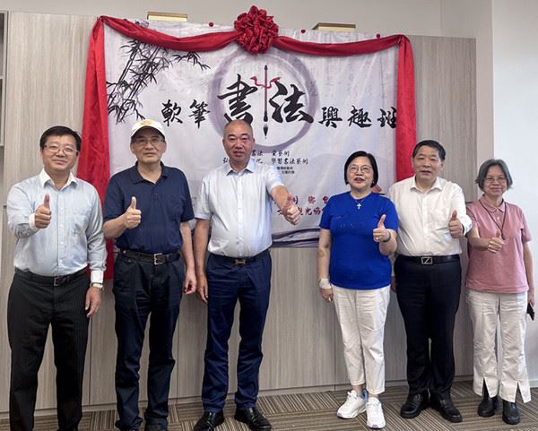 左起:朱国华常务副会长、林际平会长、陈成炉会长、方秋云会长、陆惟华博士、侯杏妹教授为书法班开学点赞