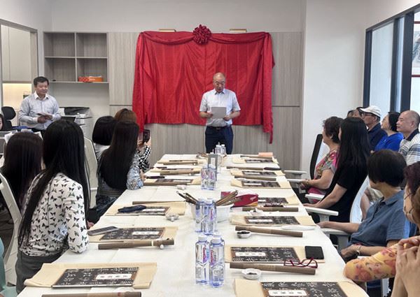 左起:林际平会长、陈成炉会长、方秋云会长、陆惟华博士为书法班开学典礼揭牌