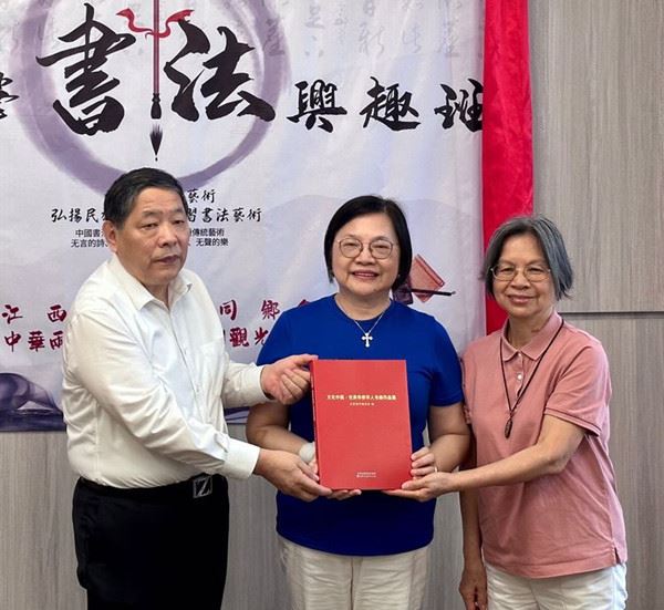 侯杏妹教授(右)、陆惟华博士(中)将天津海外联谊会主编的《文化中国·世界华侨华人书画作品集》赠予了江西省旅港同乡会会长陈成炉先生留念