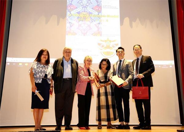 西班牙王国粤港澳商会创会主席范润棋、创会执行主席黄英亮、西班牙杭州联谊会执行会长雷蕾向瓦伦西亚丝绸博物馆赠送非遗国礼匠曼延香云纱中国好礼《醒狮围巾》。
