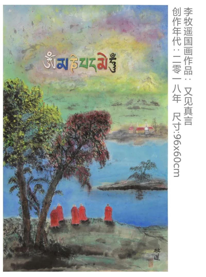当李牧遥谈到绘画作品“六字真言”的创作时,她说那时一个人在温哥华居住,没有家人陪伴,屋子还空了几间房,对一切都很陌生,难免孤独就会胡思乱想,以为有灵异物体,为了安神,想到了观音心咒六字真言。因为她每天都会画画,于是把六字真言放进了绘画作品中。