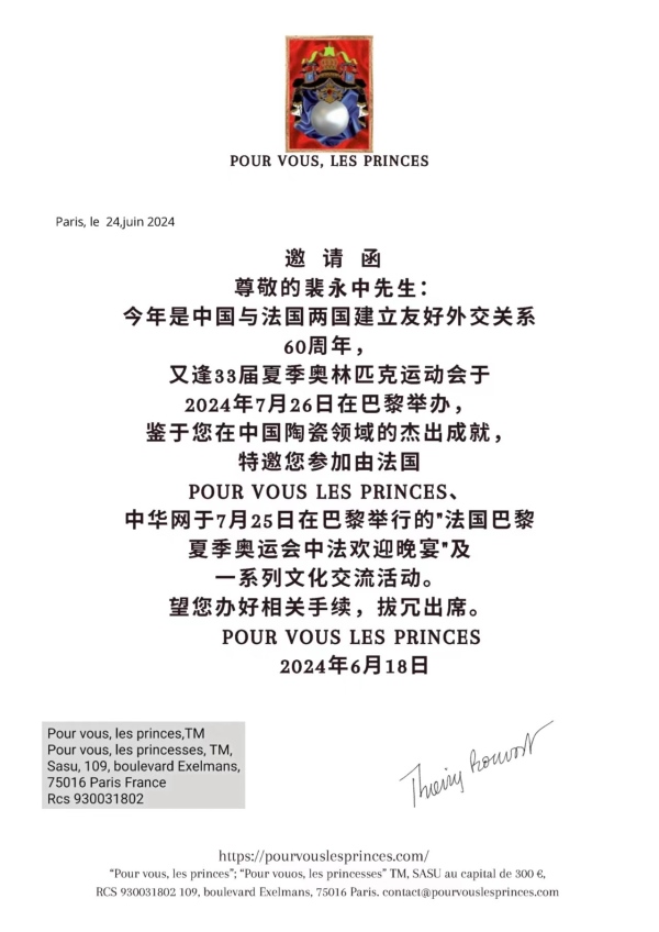 今年,恰逢中法建立友好外交关系 60 周年,与此同时,第 33 届夏季奥运会在巴黎隆重举办。在这一重要的历史节点,凭借在陶瓷领域的杰出贡献和卓越成就,裴永中老师作为中国代表,特别受邀参加在法国巴黎举行的法国巴黎夏季奥运会中法欢迎晚宴及一系列文化交流活动。