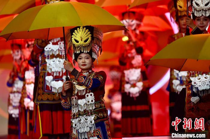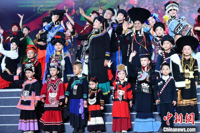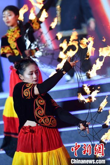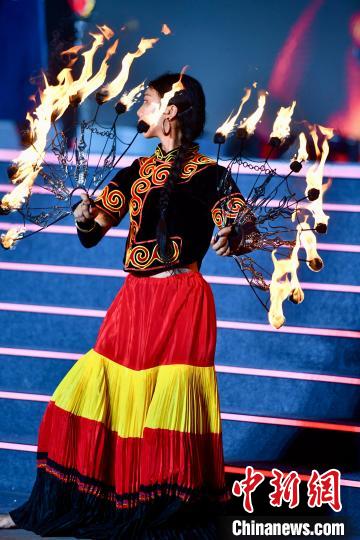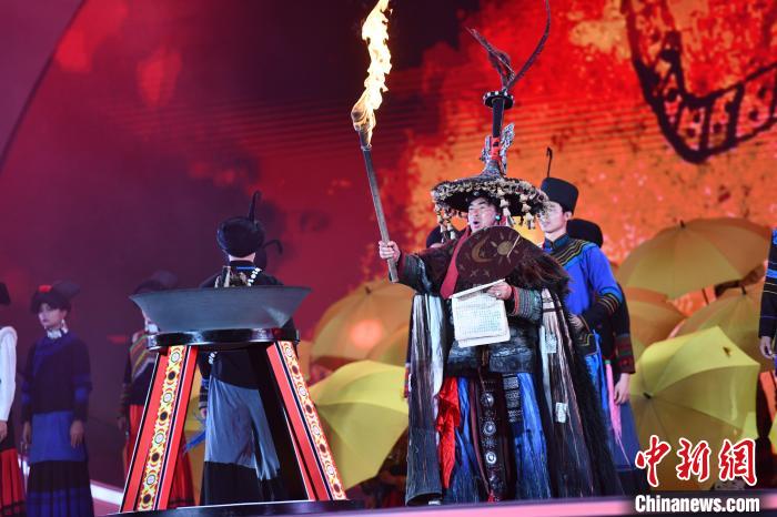 7月28日晚,四川西昌,2024年凉山彝族火把节西昌主会场在星月湖公园举行开幕式,当地民众盛装迎接,围着火堆跳达体舞。图为火把节开幕式表演。中新社记者 张浪 摄