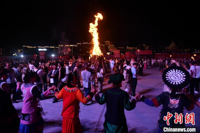 7月28日晚,四川西昌,2024年凉山彝族火把节西昌主会场在星月湖公园举行开幕式,当地民众盛装迎接,围着火堆跳达体舞。中新社记者 张浪 摄