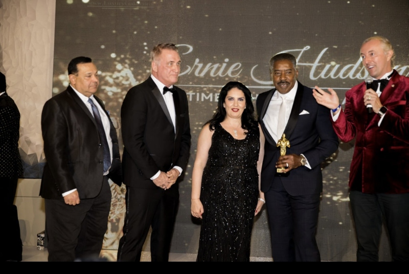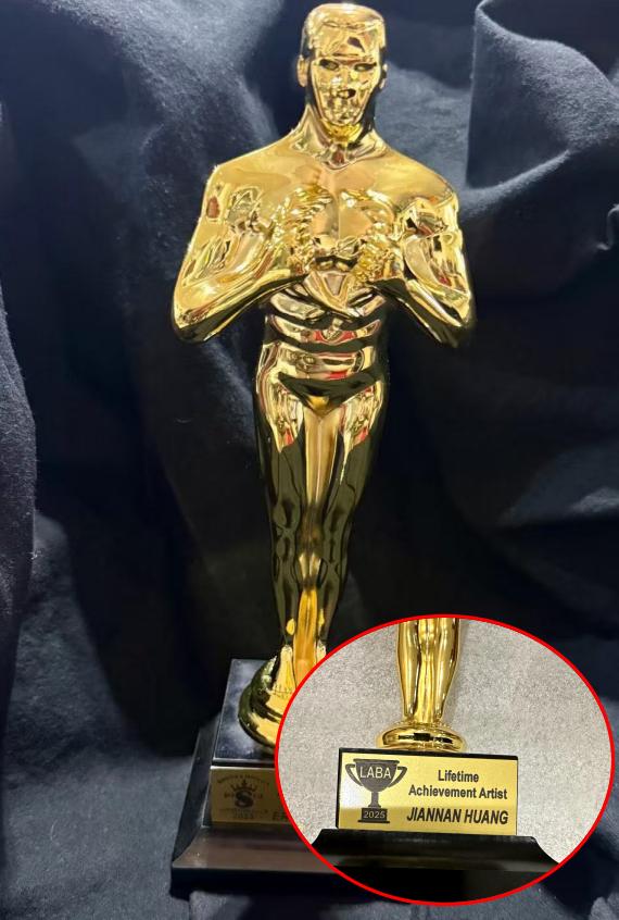 图为黄建南斩获的“97届环奥斯卡观摩晚会洛杉矶比佛利艺术偶像奖终身成就奖”