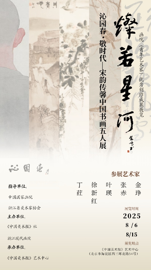 本报讯(浙文集)晴云舒卷,暑雨清凉,8月上旬的北京热烈而温馨,8月6日《沁园春.敬时代--宋韵传馨中国书画五人展》在中国美术报艺术中心喜庆开展!此展是中国国家画院主办的“‘灿若星河——画院青年艺术家优秀创作成果展览’重点扶持项目”中的画展之一,由中国国家画院指导、由中国美术报、浙江现代画院主办,由中国美术报承办。