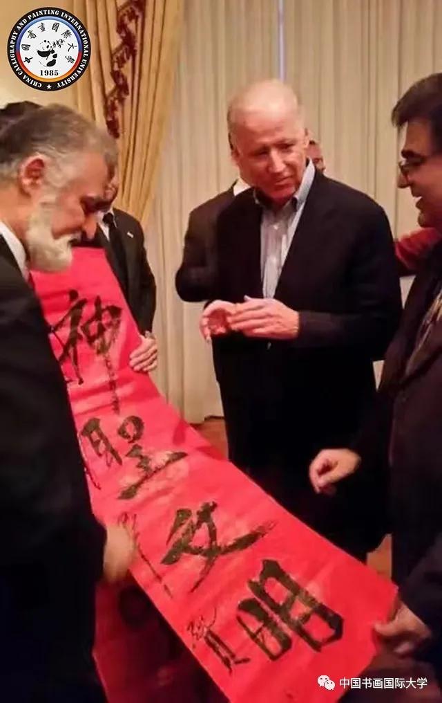 中国书画国际大学国际执行校长华赞(左)向美国总统拜登赠送其书法作品