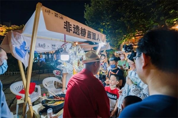 在夜晚的“青果熙市”里,大家与非遗烙画、糖画、面人等传人面对面,看到老师们现场烙制的精美扇子、捏出的齐天大圣面人和绘制的“马到成功”糖画,不断称奇。
