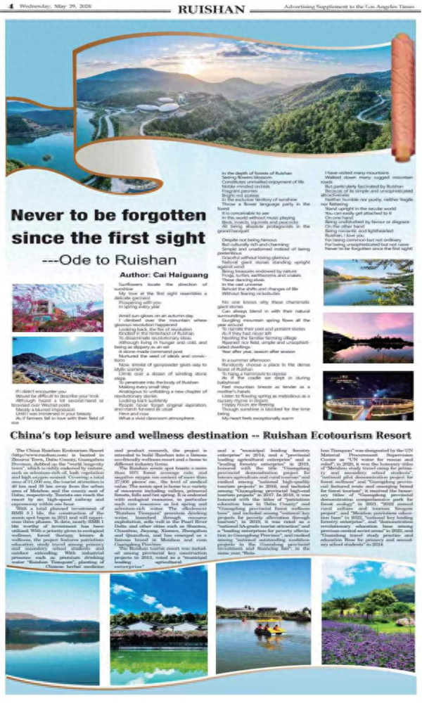 以下为英文《国际日报》、《洛杉矶时报》刊载的全文,读者朋友可从作家的笔下沉醉于集生态旅游、休闲度假、森林康养等于一体的中国瑞山,一座藏于红色苏区深山的人间伊甸园……