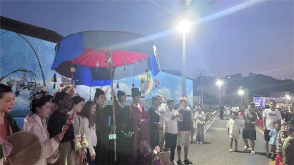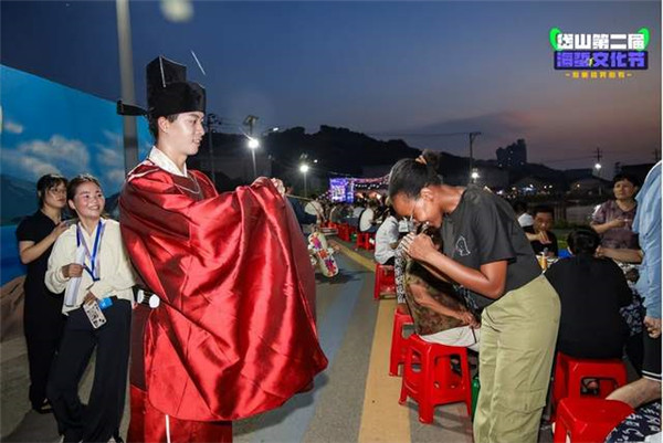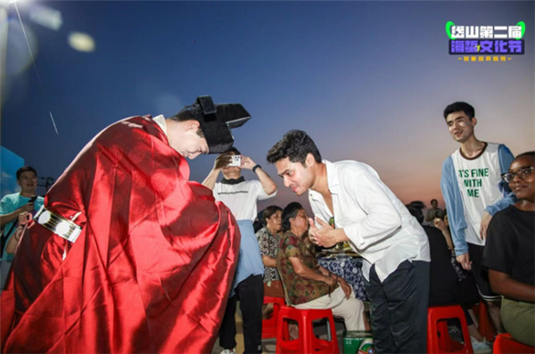 活动期间,乐队驻唱为晚宴增添了无限风情,而岱西版宋代卖货郎情景NPC巡游更是将现场氛围推向了高潮,仿佛穿越时空,回到了那个繁华的宋代市井。作为来自不同国家的文化使者,海外推介官们对于这样的传统习俗充满了好奇与尊重。他们纷纷站起身,模仿着宋代人的礼仪,向卖货郎作揖行礼。卖货郎们见状,也连忙回以作揖礼,通过这一简单的动作,仿佛建立起了一种跨越文化和国界的友谊与连接。这一瞬间,没有了语言的障碍,更没有了国界的限制。