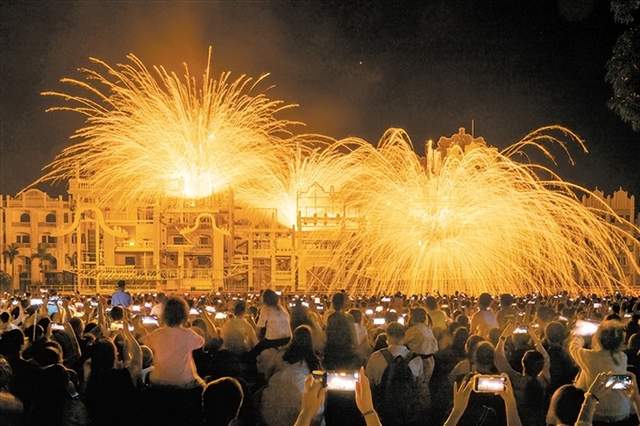 赤坎华侨古镇推出以“赤坎正当红”为主题的系列活动:白天万千赤子歌唱祖国,晚上“火秀”表演庆贺华诞,现场还有超50场非遗大戏和中西演艺节目在古镇各处上演。其中,“火秀”表演是不少游客期待的项目。赤坎华侨古镇为了回应游客的热情,本来只计划在晚上10时进行的表演,专门又在晚上7时进行了加演。此外,火壶、铁花、火龙以及烟火接连上演。游客们纷纷拿出手机拍摄,定格这难忘的一刻。
