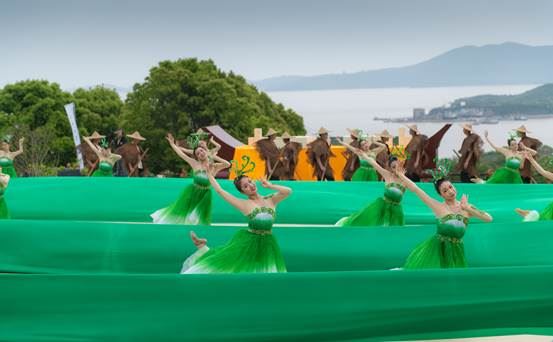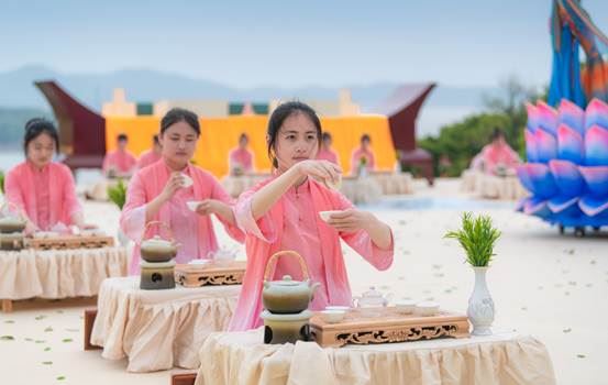 整个文艺表演呈现了一台集茶文化、音乐舞蹈、造型艺术等元素于一体的大型实景演出,让观众感悟佛茶文化韵味,感受海丝文化魅力,感知幸福普陀风范。此外,在开幕式上,国际友人为本届佛茶文化节发来贺词。