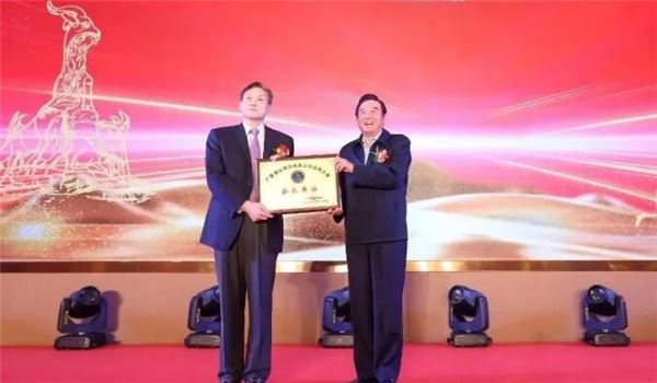 图为李乾元上将为李建国监事长颁发牌匾