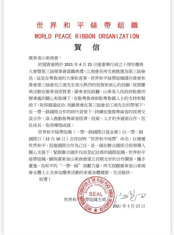 陈恩田在贺信中说:欣闻贵会举行成立十周年庆典大会暨第三届理监事会就职典礼,江南会长再次被推选为第三届会长,这是在粤鲁商的大事和喜事。祝愿贵会在第三届会长江南先生的带领下,在一带一路国际合作的时代背景下,持续加强鲁粤两省的经济交流合作,深入推动鲁粤两省经济、技术、人才的多层面合作,茁壮成长,取得辉煌成就。世界和平丝带组织愿与贵会建立长期友好合作关系,携手奋进,为和平的“一带一路”贡献力量。