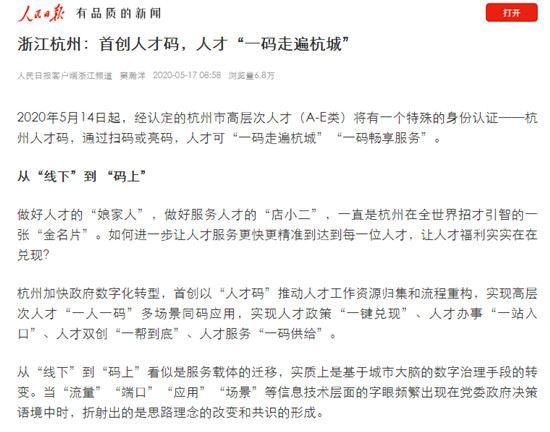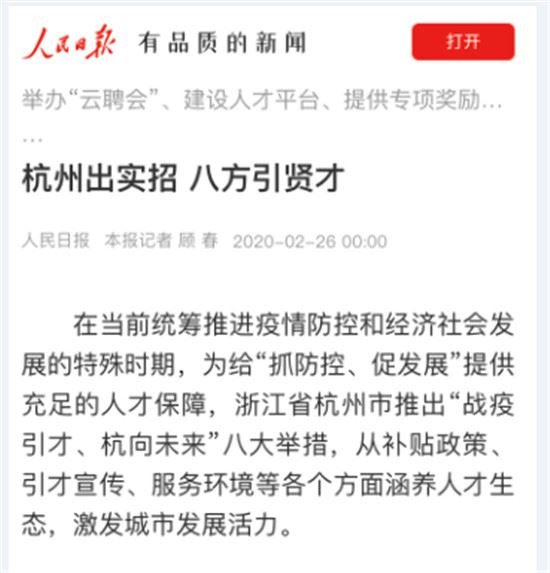 人民日报刊发《杭州出实招八方引贤才》文章,点赞此举是当前统筹推进疫情防控和经济社会发展特殊时期采取的特别之举。