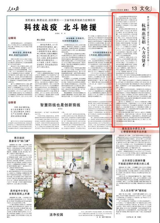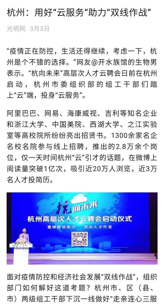 刊发《杭州出实招、八方引贤才》《云对接、云办事、云引才……开发“云服务”,杭州又先人一步》等文章,点赞此举为城市发展蓄能蓄力,是当前统筹推进疫情防控和经济社会发展特殊时期采取的特别之举。
