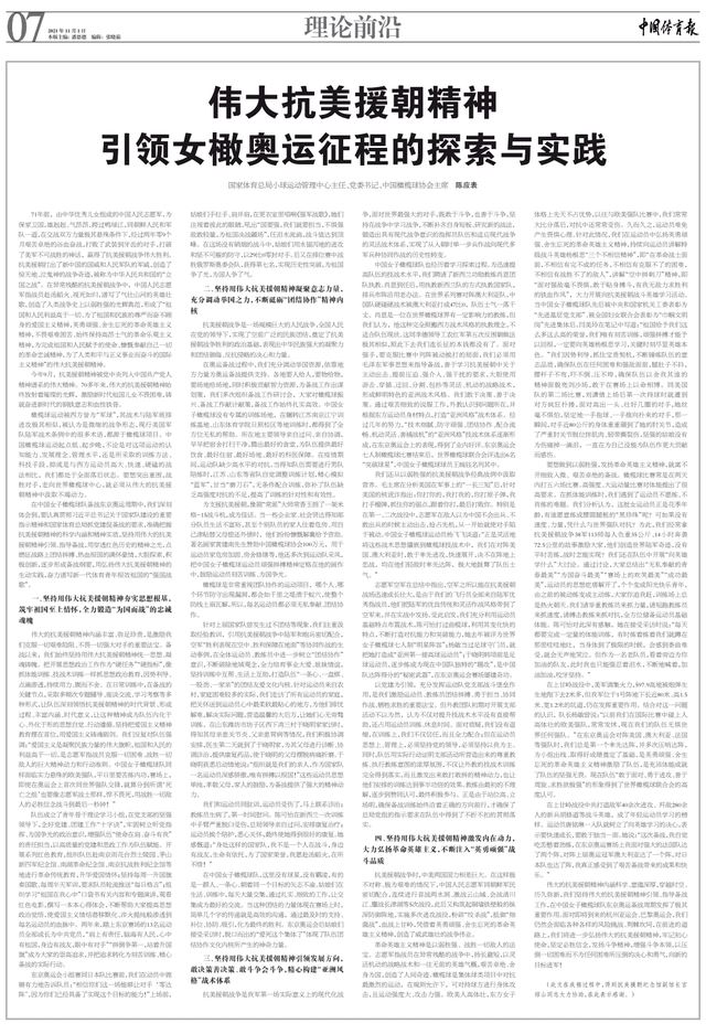 陈主任进而写道,中国女子橄榄球队在备战东京奥运期间,准确把握抗美援朝精神的科学内涵和精神实质,坚持用伟大的抗美援朝精神引领、指导备战,用穿透红色历史的精神之光,点燃征战路上团结拼搏、热血报国的满怀豪情,大胆探索,积极创新,逐步形成备战纲要,用弘扬伟大抗美援朝精神的生动实践,奋力谱写新一代体育青年报效祖国的“强国战歌”。