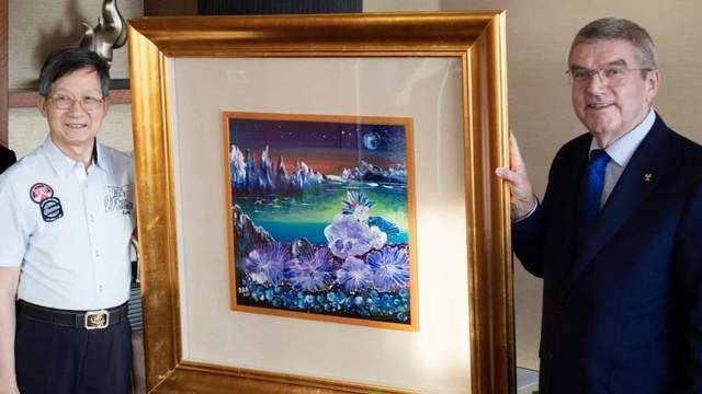 △巴赫(右)接受黄建南的《奥运之花》(资料图)