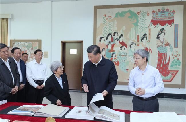 2019年8月19日至22日,习近平在甘肃考察。这是19日下午,习近平在敦煌研究院察看珍藏文物和学术成果展示,了解文物保护和研究、弘扬优秀历史文化情况。新华社记者 鞠鹏 摄