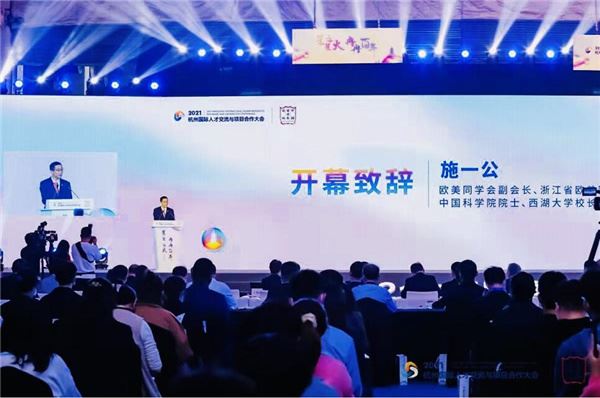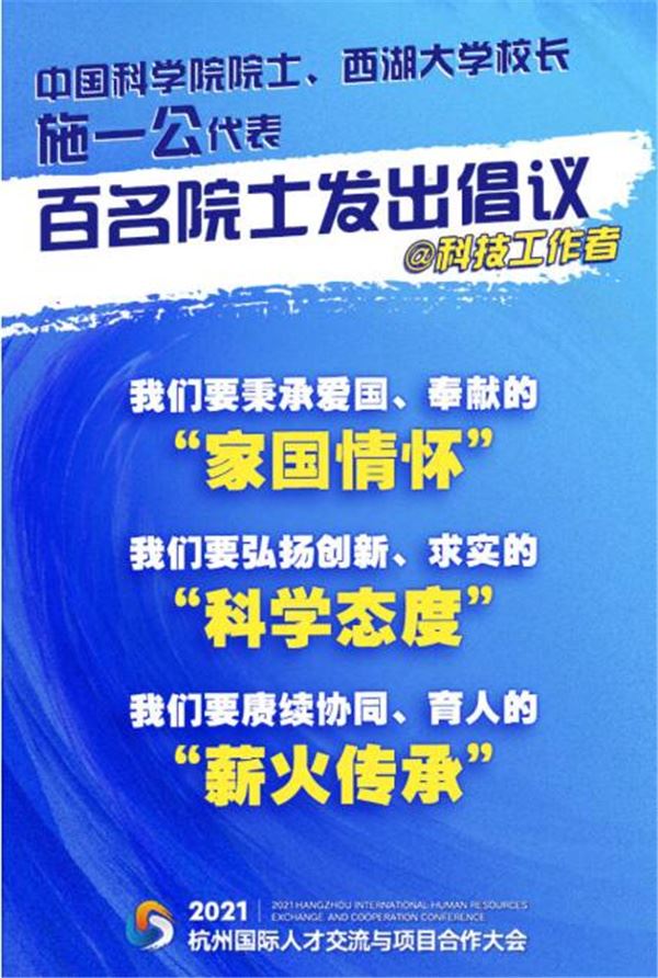 11月7日,在2021杭州国际人才交流与项目合作大会上,中国科学院院士、西湖大学校长施一公代表百名院士发起“弘扬科学家精神 推动高质量发展 建设共同富裕示范区”倡议——
