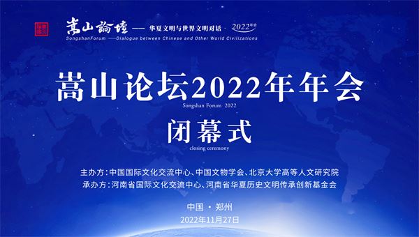 十一届河南省政协委员会副书记、副主席,嵩山论坛组委会主任,河南省国际文化交流中心理事长张广智在闭幕致辞中指出,要弘扬嵩山论坛2022年年会研究成果,呼吁以“仁者之心”对待世间万物,以求同存异、彼此尊重、相互理解、互相包容、互信共荣地开展文明对话,弘扬和平、发展、公平、正义、民主、自由的全人类共同价值;呼吁完善全球公共卫生治理体系,形成应对疫情的强大国际合力,推动建设人类健康共同体;呼吁开展文明对话,消除隔阂与误解,筑牢和守护人类共同价值,努力追寻“天下归仁”的美好世界。