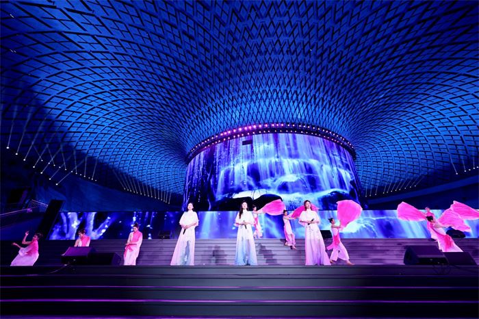 当晚举行的开幕式暨“梦应雪窦山”禅乐音乐会,把国内最新的元宇宙数实融合技术和禅乐音乐结合起来,多媒体歌舞《奉天而化》、女重唱《雪窦莲花开》等8个原创节目,配合AR灯光秀和XR实时融合技术,展现了雪窦山悠久深厚的历史文化和恢弘壮丽的建筑美学,让观众感受了虚实交融、美轮美奂的沉浸式体验效果。