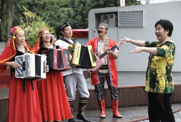 在社区广场,手持民族乐器的十余名居民身着艳丽的民族服饰,正进行日常排练。据了解,安公社区鼓励居民组建了15个歌曲、舞蹈、民族乐器等社团组织,吸纳各民族成员355人,开展各类惠民演出、文化表演和公益活动等百余场。这些活动不仅丰富了居民精神文化生活,更成了促进多民族文化交流互鉴的重要力量。
